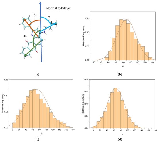 (a) Angles selections; (b) distribution of the angle between the bilayer normal and the tricyclic part vector of Q1; (c) phenyl part vector of Q1; and (d) aliphatic part vector of Q1.