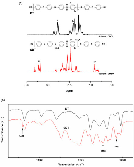 (a) 1H-NMR and (b) FT-IR spectra of DT and SDT.