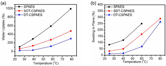 To assess membrane stability, the water-absorbing ability and swelling behavior of the cross-linked membranes were compared to those of the linear SPAES membrane. Figure 4 shows the water uptake values and swelling ratios of the membranes. As the temperature was increased, both the water uptake and swelling ratio of the membranes increased rapidly. The swelling ratio of the linear SPAES membrane beyond 60 °C could not be measured because of its excessive swelling at these temperatures. In contrast, the water uptake values and swelling ratios of the cross-linked membranes were much lower than those of the linear SPAES membrane because the cross-linked network prevents excessive swelling by water absorption [33,34]. Therefore, the cross-linked structure produced using polymeric cross-linkers was effective in enhancing the dimensional stability of the membranes. Meanwhile, the cross-linked membranes produced in this work exhibited relatively higher water uptake and swelling ratios than those of previously reported cross-linked membranes with similar DS values [11,24,27]. This is possibly due to the flexibility and long length of the polymeric cross-linkers with a sulfide bond structure. After cross-linking, many free volumes among the polymer chains remain. This allows more water to be absorbed in the membranes, which ultimately increases their swelling ratio. In addition, the SDT-CSPAES membrane registered a relatively higher water uptake and swelling ratio than the DT-CSPAES membrane due to its hydrophilic SDT cross-linkers, which can attract more water than DT. Oxidative stability of the membranes was investigated by the Fenton’s test (Table S1). As expected, both cross-linked membranes are much more stable than the linear SPAES membrane.