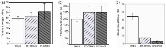 Figure 5 shows the mechanical properties, such as tensile strength, Young’s modulus, and elongation at break, of the membranes. The tensile strength and elongation at break of the linear SPAES membrane were 47 MPa and 34%, respectively. In comparison, the cross-linked membranes exhibited higher tensile strength and Young’s modulus and lower elongation at break than linear SPAES membrane, because the cross-linked structure strengthens the mechanical toughness and lowers the polymer chain mobility [34,35]. Comparing the effects of two cross-linkers, DT was found to be a more effective cross-linker in increasing the mechanical strength of linear SPAES because of the high cross-linking density of the DT-CSPAES membrane assumed from the gel fraction value. However, the brittleness of this membrane, which can be seen from its very low elongation at break value (4%), makes it difficult to use it as a membrane for practical fuel cell operations. Therefore, considering its improved tensile strength and Young’s modulus, and reasonable elongation at break, the SDT-CSPAES membrane is deemed more appropriate for practical applications.