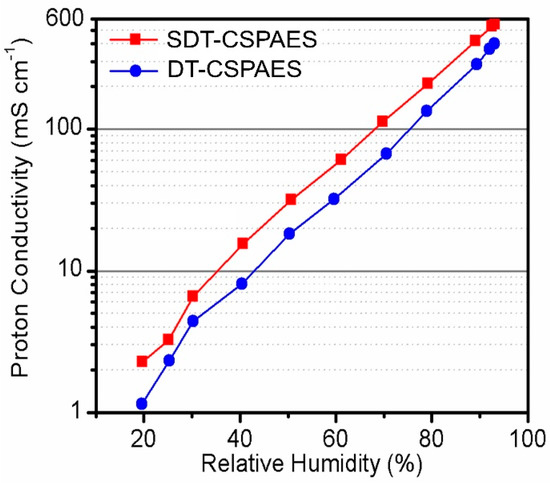 Proton conductivity of SDT-CSPAES and DT-CSPAES membranes at 120 °C as a function of RH.