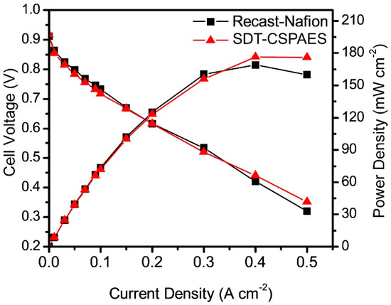 Based on the measured mechanical properties and proton conductivity, the SDT-CSPAES membrane was used for the fuel cell performance evaluation. Since the cell performance of linear SPAES membrane cannot be measured due to the failure of the membrane in the activation step, recast-Nafion (20–25 μm) was used as a reference membrane for comparison. Figure 7 shows the polarization curves at 120 °C and 40% RH of the MEAs made from the SDT-CSPAES membrane and recast-Nafion. The MEA made from SDT-CSPAES membrane registered a slightly higher maximum power density (176.4 mW cm−2) than that made from the recast-Nafion (169.0 mW cm−2). The expected cell performance improvement corresponding to the high proton conductivity of the SDT-CSPAES membrane was not achieved because the MEA preparation processes and components were optimized for the PFSA ionomer membranes. Nevertheless, the results demonstrate that the SDT-CSPAES membrane prepared with use of a highly sulfonated polymer and hydrophilic polymeric cross-linker was an effective cross-linked membrane for PEMFC applications.