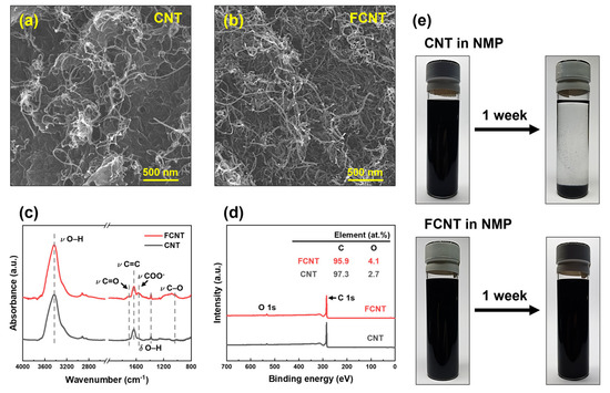 Characteristics of CNT and FCNT. (a,b) Microstructure. (c) ATR-FTIR spectra. (d) XPS spectra. (e) Dispersibility and stability.