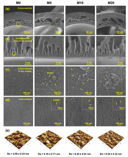 Microstructure of PES and FCNT/PES nanocomposite HF membranes. (a–c) Cross-section. (d) Inner surface. (e) Inner surface roughness.