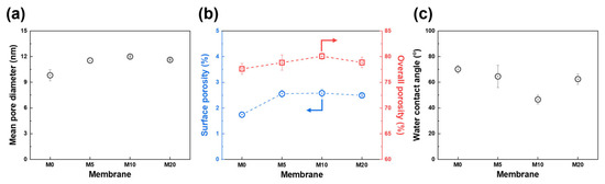 Physical properties of PES and FCNT/PES nanocomposite HF membranes. (a) Mean pore diameter. (b) Surface (blue) and overall (red) porosity. (c) Water contact angle.