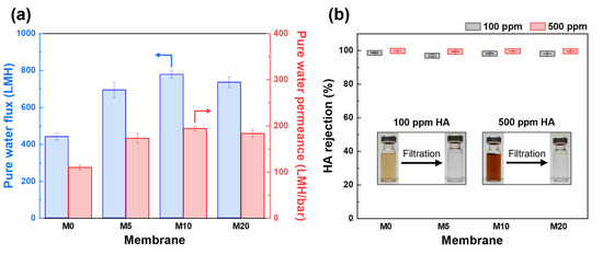 As shown in Figure 6a, the pure water flux and permeance of the FCNT/PES nanocomposite HF membrane were significantly higher than those of the pristine PES HF membrane (M0). The pure water flux and permeance of M0 were 440.4 LMH and 110.1 LMH/bar, respectively, while those for the M10 were 777.3 LHM and 194.3 LMH/bar, respectively. This enhancement is attributed to the increased pore size and porosity, as well as the enhanced hydrophilicity of the membrane [6,17,42].