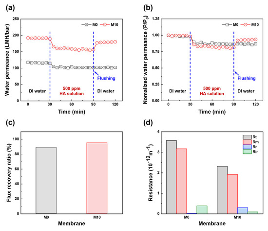 Based on the filtration performance of the fabricated HF membranes, M10 was selected to investigate the antifouling performance and M0 was used as the control membrane. As shown in Figure 7a, the selected membranes were tested using DI water and a 500 ppm HA solution. After replacing the HA solution as a feed solution, both M0 and M10 exhibited an immediate water permeance decline from 114.7 to 105.0 LMH/bar and from 189.0 to 165.5 LMH/bar, respectively, due to the deposition and adsorption of HA on the membrane surface. Subsequently, the water permeance of both membranes continuously decreased to 101.5 and 156.5 LMH/bar for M0 and M10, respectively, during HA solution filtration. Although the water permeance decreased, the permeance of M10 was still higher than that of M0, owing to its large pore size, high porosity, and hydrophilicity. After cleaning, the water permeance value of M10 was close to the initial value, whereas the water permeance of M0 hardly recovered. In addition, the normalized water permeance, FRR, and resistance profiles (i.e., Rt, Rm, Rr, and Rir) were calculated from the HA filtration test results to investigate the fouling behavior and antifouling properties. As shown in Figure 7b, the normalized water permeance clearly shows a change in permeance behavior compared to the initial water permeance of each membrane during the fouling test. After replacing the HA solution, M10 exhibited a higher normalized water permeance reduction than M0. This is because the larger pore size, higher porosity, and rougher surface of the membrane indicate a higher fouling tendency [1,51]. However, the FRR of M10 was higher than that of M0. As shown in Figure 7c, the FRR values are 89.0 and 95.4% for M0 and M10, respectively. Figure 7d shows the resistance profiles of the membrane and fouling layer. M0 has a higher Rm than M10 because of its smaller pore size, lower porosity, and hydrophilicity. The resistance of the fouling layer on M0 mainly consists of Rir, whereas the resistance of the fouling layer on M10 mainly consists of Rr. The hydrophilic membrane surface forms a hydration layer on the membrane surface owing to the blended FCNT, which diminishes the adhesion force between the HA and membrane surface, resulting in the fouling layer being washed easily from the membrane surface by the cleaning process [6,11,42,52,53].