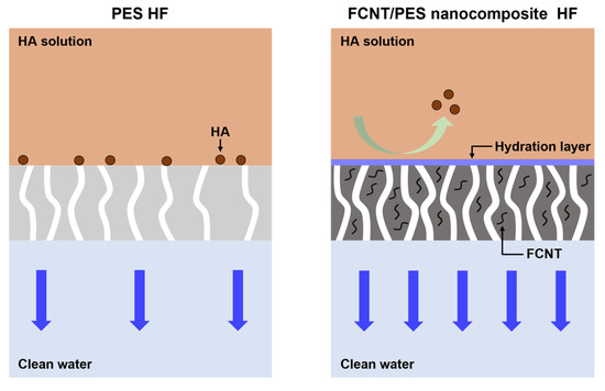 Schematic illustration of filtration and antifouling mechanisms of PES and FCNT/PES nanocomposite HF membranes.