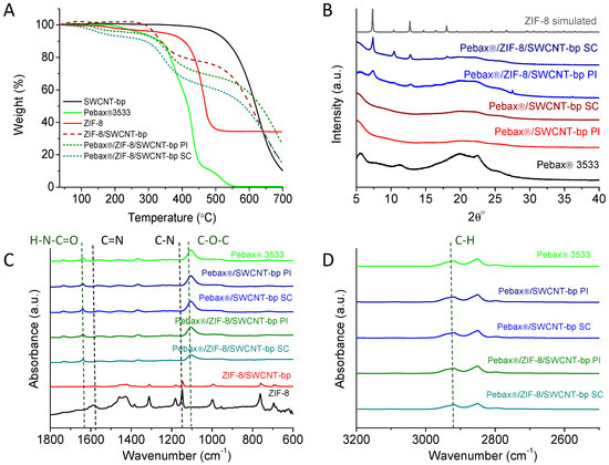 The XRD diffractogram shown in Figure 3B confirms the correct synthesis of the ZIF-8 layer (with some shielding from the polymer coating) with the presence of the most intense and characteristic peaks of ZIF-8 (7.4, 10.4 and 12.7°) in agreement with the simulated pattern [32]. It can also be seen the characteristic peaks of Pebax® 3533 at 5.8, 11.3 and 22.4° [29,33,34]. In addition, the more defined ZIF-8 peaks in the Pebax®/ZIF-8/SWCNT-bp-SC correlate with the lower thickness of the polymer layer obtained by the spin-coating technique and observed by SEM (Figure 2C,D).