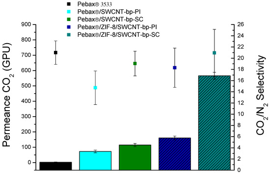 The gas separation performance of the membranes was tested for the 15:85 CO2/N2 mixture at 35 °C and 3 bar feed pressure. Three different membrane samples of each type were evaluated at the same conditions to demonstrate the reliability of the membranes and their preparation procedures, allowing, in turn, the calculation of the error bars shown along this section. The results of the experiments are depicted in Figure 4, where the parameters corresponding to a Pebax® 3533 dense membrane are also shown for comparison.