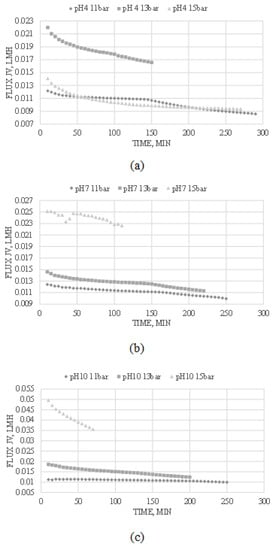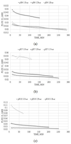 Moreover, it can be seen from Figure 3b that at a pH solution of 7 with a net charge close to IEP, the ionic flux decreases steeply at the operating condition of 15 bar but rises again over time, thus creating a V shape curve. This event may occur due to the fouling of the membrane. Ionic flux is suspected to be lowest at the IEP of the feed and increases when the pH is adjusted away from the dominant charge of the ions [38]. At an operating pressure of 15 bar, the flux increases after a steep decrease due to the constant contact between the ions and the membrane under a high pressure which causes a high driving force. Moreover, an increase in driving force increases the permeate flow by producing higher turbulence which causes dispersion within the solute molecules near the membrane surface, reducing the layer thickness of the membrane and countering the concentration polarization. The high shear rates generated from the high driving force near the membrane surface cause the accumulated layers of ions to strip, reducing the hydraulic resistance of the membrane fouling [38,41].