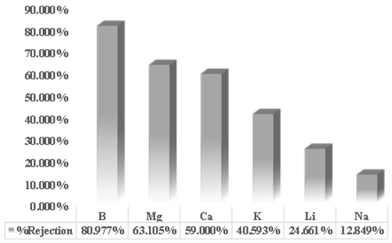 Figure 4 shows the rejection values for each ion contained in geothermal brine. Theoretically, the larger the radius of an ion, the more difficult it is for the ion to pass through the membrane. However, the results showed that boron, which has the smallest ionic radius, actually had the most significant rejection percentage compared to other ions. This phenomenon is because the measured ions are in the liquid, so the radius that must be used as the primary reference is the hydrated radius. Therefore, when viewed from the size of the hydrated radii in Table 1, the order of the radii of each ion is B > Mg > Ca > K > Li > Na. This phenomenon is in line with the research results depicted in Figure 5.
