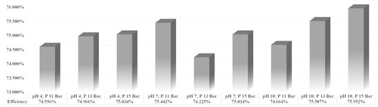Additionally, Figure 2b,c show that an increase in pressure leads to an increase in flux. This event happens due to the increased driving force applied to the system. The increase in pressure upon the system provides an increased driving force, which results in increased permeate flux. However, Figure 2a does not follow the same trend as Figure 2b,c. The flux of Figure 2a shows a permeate flux within a feed solution with an acidic pH value of 4. Within an acidic environment, the membrane resistance increases, which causes the membrane pores to clog. This phenomenon eventually leads to the accumulation of specific ions near the boundary layer of the membrane surface, causing concentration polarization and incrustation [38]. The concentrated ion layer causes the osmotic pressure along the surface of the membrane to increase, causing a decrease in net driving force and resulting in lower flux [39]. Thus, by analyzing the results shown by the different trends of the solution flux, it can be concluded that the best operating condition to extract lithium by nanofiltration is at an operating temperature of 15 bar at a feed solution pH of 10, which gave the highest solution flux compared to other operating condition results.
