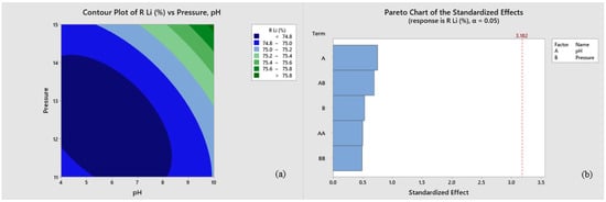 Figure 6 compares the experimental factor variables to the lithium recovery percentage. The percentage value of lithium recovery was calculated using Equation (10) and optimized using the Minitab Statistical Software application to obtain the Pareto graph in Figure 6. Furthermore, Figure 6a shows a contour plot representing the relationship between factor variables (pressure and pH) and lithium percentage recovery from geothermal brine using the nanofiltration method. An increase in pH results in a greener region, indicating a more significant recovery percentage. Similarly, an increase in pressure shows a light blue color, almost close to the green, indicating an increase in the recovery percentage. From the description, the weaker the blue or closer to the dark green, the better the lithium recovery from each brine solution.
