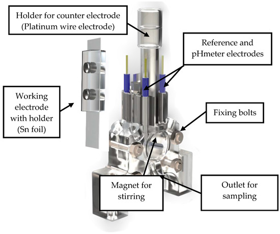 For the electrochemical experiments, bulk tin (Sn) was chosen as the electrocatalyst for CO2 electroreduction due to its low cost, ease of use and its selectivity toward FA, as described in previous publications [6]. The reactor’s structure was the same H-type cell as used previously, but with greatly reduced size. Furthermore, a Nafion 117 membrane was used as a proton exchange membrane. The membrane has high proton permeability (H+) while maintaining a reasonably low permeability to formic acid [8]. Similar approaches are used for the electrochemical production of methanol [9] and catalytic synthesis [10,11]. The electroreduction of CO2/bicarbonate solutions is affected by many parameters, as described in our previous work. In addition, experimentation needs to be carried out by trial and error; therefore, researchers face the challenge of having to perform large numbers of experiments. Thus, the main aim and novelty of this study was designing and manufacturing a reactor as small, simple and easy to handle as possible in order to simplify and increase the speed of testing. In addition, this will also help to reduce the amount of reagents, reducing the economic cost of experiments while making it easy to assemble, disassemble and manipulate. Moreover, by increasing the ratio of the catalyst’s area to the reactor’s volume, the concentration of the products was increased, facilitating their identification and quantification. For that purpose, stereolithography 3D printing tool [12] was used. Nowadays, 3D printing is gaining interest in many research fields [13]. This novel manufacturing technique presents several advantages over conventional subtractive ones [14], e.g., faster prototyping, the possibility of printing more complex objects and therefore reducing the total number of parts, simplifying assembly, and reducing its size and thus the manufacturing cost.