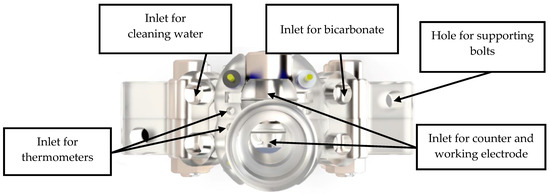 - The module should have one hole to accommodate the counter-electrode on the anodic compartment, and another one in the cathodic compartment for the working electrode.