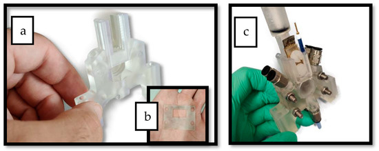 (a) Photo of one of the reactor’s compartments after printing. (b) Silicon sheet used to seal the gap in between the two compartments. (c) Photo of the final assembled reactor after printing.