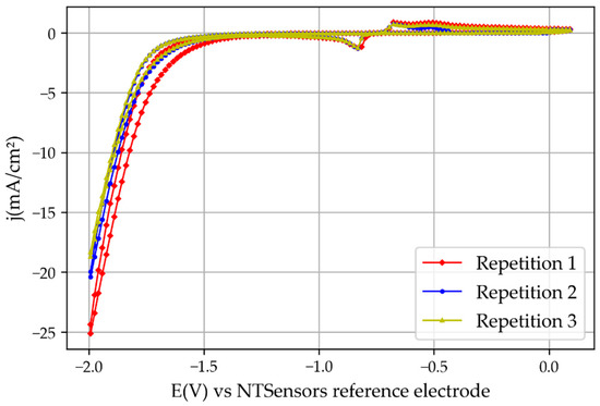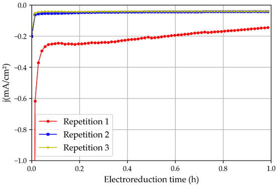 To confirm the possibility that the higher current density obtained in Repetition 1 was caused by the oxide layer, another set of experiments was performed with new non-treated and non-pre-oxidized tinfoil. The results (Figure 9) showed that the first experiment presented only a slightly higher intensity than the later consecutive repetitions, possibly because of oxidation residues, but this was still significantly lower than those obtained when the foil was pre-oxidated for 24 h. Therefore, it can be stated that the native layer of tin oxide (SnO2) plays a very important role in the activity of the catalyst, as described in [17].