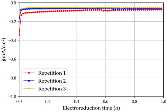 Three repetitions of the chronoamperometric test using new tin catalysts that had not been oxidated in the atmosphere and the 3D printed reactor.