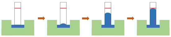 The capillary migration rate of the prepared membrane was measured by the following steps. The sample was cut into 2 cm wide by 6 cm long pieces and DI water was used as the migration medium. Experiments were performed at room temperature (27 °C) and ambient pressure. The measurement started when the membrane was in contact with deionized water and the water migrated along the membrane surface for about 5 mm, and stopped when the water migrated to the membrane surface for 4 cm. The experimental process is shown in Figure 3.