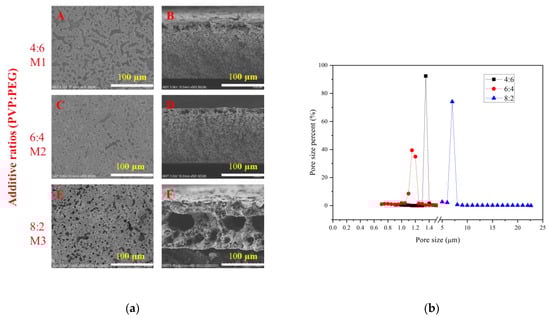 The pore size distributions of membranes prepared with different additive ratios are shown in Figure 4b. When the ratio of PVP to PEG is 4:6 and 6:4, the pore sizes of the prepared membranes are about 1.3 microns and 1.2 microns, respectively; when the ratio reaches 8:2, the pore size of the prepared membrane is about 7 microns, which is consistent with the SEM photos. This is because when the ratio of PVP and PEG is relatively close, the viscosity of the casting solution is not much different, but when the ratio of PVP and PEG reaches 8:2, the viscosity of the casting solution increases significantly, hindering the phase separation kinetics. The hydrophilicity significantly improves the thermodynamics of phase separation. For the polymer-solvent-non-solvent ternary system, hydrophilic PVP with larger molecular weight can replace part of the polymer and increase the miscible region; the affinity with polymers and solvents is changed, increasing the thermodynamic in-stability of the casting film; and the binodal curve becomes closer to the (polymer)–(solvent/non-solvent) axis. PEG with smaller molecular weight can be regarded as a weak non-solvent. When replacing part of the solvent in the casting solution, the difference in the composition of different parts of the casting solution caused by the diffusion rate in the film-forming process can be reduced. The effect is to reduce the time difference in the phase-separation process and improve the uniformity of the membrane aperture.