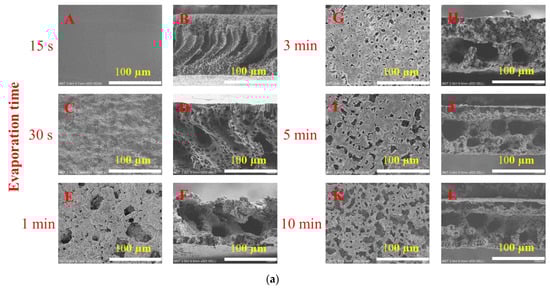 The morphologies of membranes prepared with different exposure times are shown in Figure 5a. When the exposure time was 15 s, the membrane showed a finger-like structure with a dense layer on top. Due to the short exposure time, the casting liquid quickly entered the NIPS process. Rapid exchange occurs because of a high affinity between non-solvent and solvent. Therefore, the solvent flowing out into the coagulation bath brought the polymer chains to the top surface of the membrane, resulting in a higher polymer concentration on the top surface of the membrane, forming a dense skin layer [15]. When the exposure time was 30 s, pores began to appear on the surface, finger-like pores still appeared on the cross section, and large cavities began to appear. When the exposure time was 1 min, macropores began to appear on the surface of the membrane, and the cross-section showed a micron-scale cavity structure. With the increase in exposure time, the number of pores on the surface of the membrane increased, and the exposure time of 3–10 min had little effect on the cross section, and all showed micron-scale cavity structure. This is because as the exposure time increases, especially when the exposure time is greater than three minutes, the casting film solution enters the NIPS process from the previous state very quickly, and thus it first goes through a longer VIPS process and then enters the NIPS process; therefore, the solvent and non-solvent exchange rates slow down, and pores begin to appear on the membrane surface. The cross-sectional structure changes from a finger-like macroporous structure to a sponge-like structure [16,17]. However, due to the high molecular weight of PVP, agglomeration occurs with the increase in VIPS time, so a large amount of PVP is eluted during the NIPS process, resulting in large cavities in the cross-sectional structure.
