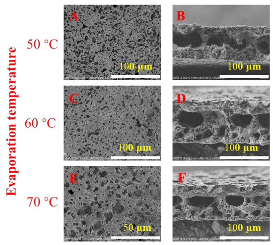 SEM images of PVDF membranes prepared at different vapor temperatures. (A,B) 50 °C; (C,D) 60 °C and (E,F) 70 °C.