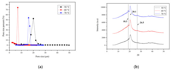 Figure 7a shows the pore size distribution of PVDF membranes prepared at different vapor temperatures. It can be seen from the figure that the pore size distribution of the membrane prepared at the vapor temperature of 60 °C is the most concentrated, around 8 microns. In addition, the membranes prepared at 50 °C and 70 °C are concentrated at around 16 and 20 microns, respectively. This is consistent with the SEM photo results.