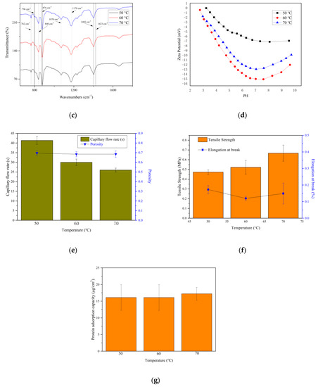 Figure 7d shows the zeta potentials of PVDF membranes prepared at different vapor temperatures. At pH = 7, the surface of the membrane prepared at 60 °C had the greatest negative charge. Since the pore size of the membrane prepared at 60 °C is relatively small, it indicates that more PVP was involved in the membrane formation on the membrane surface. PVP is a hydrophilic material [15], which reduces the absorption of negative ions on the membrane surface in the electrolyte solution, thereby reducing the negative zeta potential of the membrane surface [23].