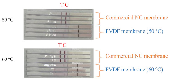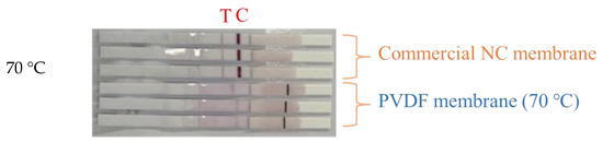 Figure 8 shows the application of PVDF membranes prepared at different vapor temperatures in the actual colloidal gold test strips. As can be seen from the figure, compared with the commercially available NC membrane, the test line T of the self-made membrane did not develop color, and the quality-control line C developed a light color. This may be because the protein adsorption capacity of these membranes was low, and the surface had less negative charge, and could not form stable binding with the antibodies immobilized on the surface. The capillary flow rate is too fast, making it difficult for unadsorbed antibodies to be firmly anchored on the membrane surface. It is easily washed away by the sample to be tested, resulting in an inconspicuous line display [3].
