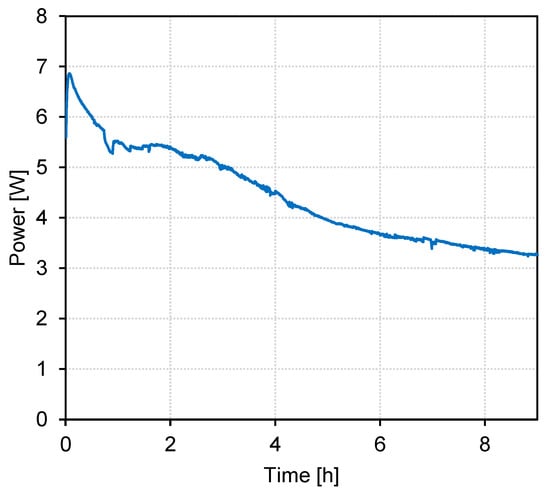 The EDBM experiment with BL permeate was conducted for 9 h at a constant cell voltage of 10 V, and the current was monitored throughout the experiment. The resulting development of power is plotted in Figure 2, showing a constant decrease in power consumption during the course of the experiment. The current decreased from 0.69 A at the beginning to 0.33 A at the end of the experiment, corresponding to current densities between 69 and 33 A/m2.