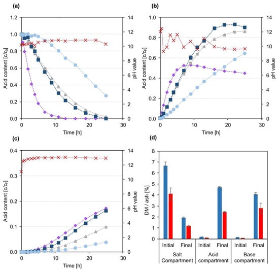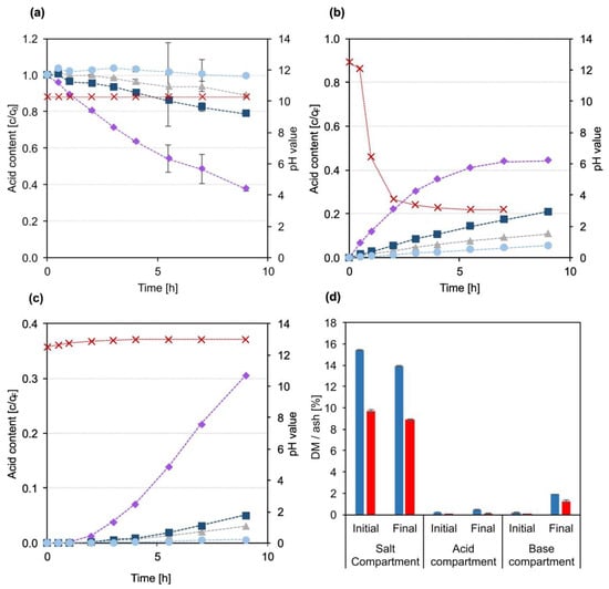 Development of carboxylic acid concentrations and pH value over the course of the long-term EDBM experiment with BL model solution. (a) Salt compartment; (b) acid compartment; (c) base compartment. For (a–c): ■ glycolic acid, ● lactic acid, ♦ formic acid, ▲ acetic acid, X pH value. (d) DM (■) and ash (■) content measured in the initial and final samples from the three compartments.