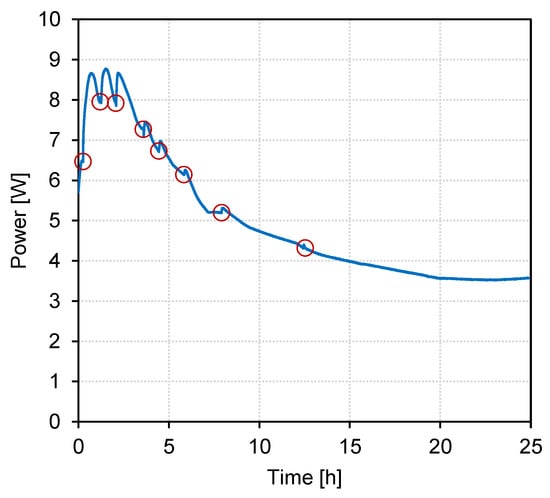Power over treatment time for the batch EDBM treatment of BL model solution, Ucell = 10 V (constant). The red circles mark the points of NaOH addition.