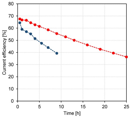 The two EDBM experiments were evaluated based on current efficiency, power consumption and hourly yield of carboxylic acids. The calculations were based on the measured yield in the acid compartment only. The development of current efficiency for both experiments is depicted in Figure 6. The initial current efficiency in both experiments was similar, but the decrease was faster for the experiment with BL permeate. A reason for the decrease in current efficiency is the loss of acids by diffusion back into the feed and the base compartment, as well as the competing migration of OH− and potentially other anions. Comparable current efficiencies were reported by Kumar and Alén [14] for recovery of sodium ions from dilute, carbonated soda BL.