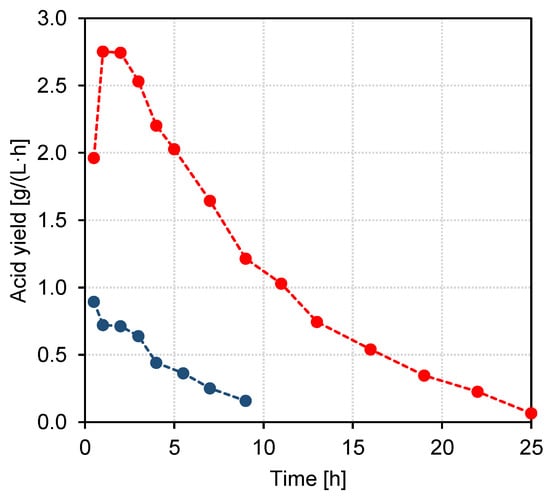 Finally, the hourly yield of acids was compared for both experiments; the results are shown in Figure 7. In agreement with the development of current density and current efficiency, the acid recovery in the acid compartment was generally faster in the experiment with BL model solution. This shows the need for further improvement of the process. From the results of the model solution experiment it can be shown that maintaining a high pH value in the acid compartment considerably increases the recovery as it slows diffusion of acids to the base compartment and increases the electrical conductivity in the acid compartment. This in turn leads to a higher current efficiency and acid recovery rate and can, together with a longer treatment time, also lead to an increase in acid recovery upon treatment of BL permeate. An increase in the available membrane area could also improve the acid yield as it decreases the necessary processing time and thus limits the available time for unwanted diffusion of acids to the base compartment. Industrial-scale EDBM stacks can comprise more than 100 unit cells with much higher membrane areas (e.g., 1 m2) compared to laboratory-scale equipment [32], showing the considerable upscaling potential.