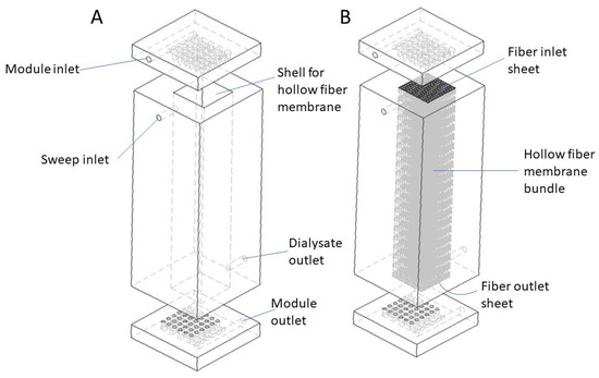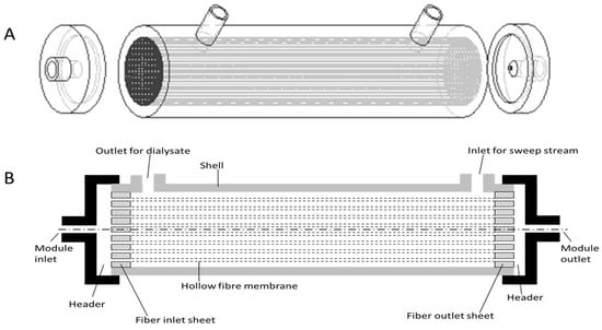 (A). Schematic drawing of a conventional hollow fiber membrane based hemodialyzer. (B) Section drawing of a conventional hollow fiber membrane based hemodialyzer.