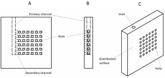 Figure 4 shows the drawings of the flow distribution plate for blood entering the lumen of the fiber bundle from the arterial port. The blood is directed to a primary channel, from which a set of secondary channels branch off sequentially. The primary and secondary channels are embedded within the flow distribution plate. Each of the secondary channels is further connected to a distribution surface through a series of holes (see Figure 4). The liquids flowing through these holes are further distributed to the bundle of hollow fiber membranes potted within a cuboid shell through the fiber inlet sheet (see Figure 3B). A small gap between the distribution surface and the fiber inlet sheet serves as the inlet header. The collection plate that drains the blood from the fiber bundle (through the fiber outlet sheet) to the venous port also has a set of secondary channels and a primary channel, which ultimately connects to the outlet (the venous port). As with the inlet side, the secondary channels are connected to a collection surface through a series of holes. A small gap between the fiber outlet sheet and the collection surface serves as the outlet header. The channels in the collection plate have the same dimensions and geometry as their corresponding counterparts in the flow distribution plates, but the arrangements of the channels in the two plates are complimentary, i.e., the plates are fabricated as mirror images of each other (see Figure 3). Such arrangement of the flow channels in the two plates is necessary to ensure that the flow within the device is uniform [42,46,47]. As can be seen in Figure 3, the inlet and outlet for blood in the cuboid hemodialyzer are located space diagonally with respect to each other.