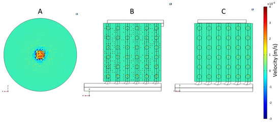 Velocity vector (z-direction) profiles for the fiber inlet plane of (A) Conventional cylindrical hemodialyzer. (B) Cuboid hemodialyzer 1. (C) Cuboid hemodialyzer 2.