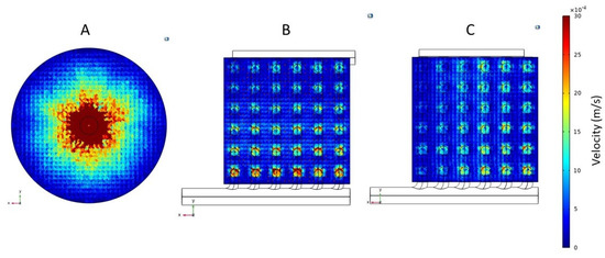 Overall velocity profiles for the fiber inlet plane of (A) Conventional cylindrical hemodialyzer. (B) Cuboid hemodialyzer 1. (C) Cuboid hemodialyzer 2.