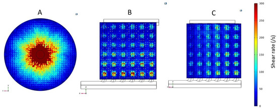 Shear rate profiles for the fiber inlet plane of (A) Conventional cylindrical hemodialyzer. (B) Cuboid hemodialyzer 1. (C) Cuboid hemodialyzer 2.