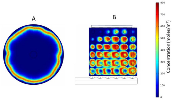 Tracer studies are useful for determining residence time distribution in flow through devices. A pulse of the tracer is introduced along with the flowing feed, and the extent to which the solute in the pulse is dispersed during its transit through the device is determined by measuring its concentration at the outlet as a function of time (or effluent volume), i.e., the sharper the solute peak, the narrower the residence time distribution. The residence time distribution is a useful tool for measuring flow uniformity (or non-uniformity). The tracer flow simulations were carried out using the conventional cylindrical hemodialyzer and cuboid 2, which was the better of the two cuboid devices. The tracer solution used was 800 mol/m3 sodium chloride in water. The volume of sodium chloride solution injected was 5% of the total internal volume of the flow path, and the flow rate was the same as the operational flow rate used in the previous experiments. CFD allows visualization of the transit of a tracer pulse through a device. Such visualization, which is based on a color coding for concentration of the tracer within the device, is useful, as it provides information, such as the location of dead zones and reasons for flow maldistribution, based on which, a device could be redesigned for better performance. It also allows qualitative comparison of the flow characteristics of different devices. Figure 9 shows the solute (sodium chloride) concentration profile at the mid-section of the headers of the two devices (conventional and cuboid 2), 0.8 s after tracer injection. The solute profile observed in the conventional hemodialyzer (see Figure 9A) indicated that at a time when solute was still present near the periphery, solute molecules traversing through the fibers located closer to the center had already entered the fiber and were hence no longer visible. Therefore, the solute residence time distribution of the conventional cylindrical dialyzer could be expected to be broad. With cuboid 2 (see Figure 9B), the tracer solute could be observed throughout the header at the snapshot time. However, due to the sequential branching of the secondary channels from the primary channel, some location-dependent differences in tracer concentration could be expected in the headers of the cuboid devices. For instance (see Figure 9B), when the solute had started disappearing in the region adjacent to the leftmost hole in the bottom row (as evident from the central discoloration), a significant amount of solute could be seen in the regions adjacent to the rightmost hole in the bottom row. Such lead and lag in concentration is compensated at the outlet side where the secondary channels and the primary channel are arranged in a complementary fashion with respect to the inlet side (see Figure 3).