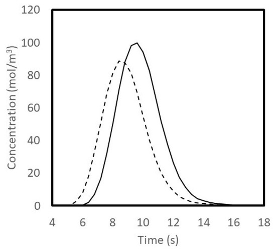 Tracer (sodium chloride) concentration peaks for conventional cylindrical hemodialyzer (dashed line) and cuboid hemodialyzer 2 (solid line).