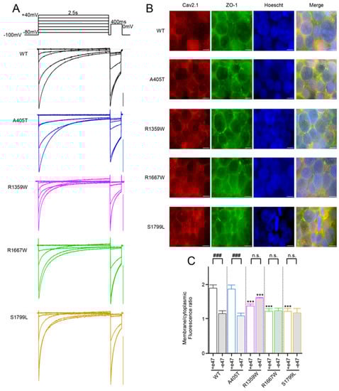 (A) Representative current traces were recorded from X. laevis oocytes that expressed the indicated Cav2.1+e47 variants with Cavβ4a and Cavα2δ1. Currents were elicited from a holding potential of −100 mV by a two-pulse protocol illustrated on top, and consisting of a 2.5 s-long depolarization from −80 mV to +40 mV, followed by a 400 ms-long depolarization to 0 mV (WT and R1359W) or +10 mV (A405T, R1667W, and S1799L). Scale bars, 200nA. (B) Representative images of HEK cells immunostained with anti-Cav2.1 (red) and anti-ZO-1 (green). Anti-ZO-1 was used to visualize the cell membrane. Scale bars, 10 μm. (C) Quantification of fluorescence intensity realized on individualized cells (n = 10 for each variant). Asterisks and number signs denote significant differences vs. WT (*** p < 0.001) and vs. Cav2.1+e47 splice variants (### p < 0.001), respectively (non-paired Student’s t-test). n.s. = non-significant.