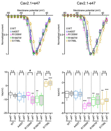 Voltage dependence of Cav2.1 activation. (Top) Average current-voltage relationships for X. laevis oocytes expressing Cav2.1+47 (left) or Cav2.1−e47 variants (right). (Bottom) Box plots of half-maximal activation potential (Va, left) and slope factor of the Boltzmann curve of channel activation (ka, right) were obtained for all Cav2.1 variants studied. The mean values are given in Table 1. Asterisks and number signs denote significant differences vs. WT (** p < 0.01, *** p < 0.001) and vs. Cav2.1+e47 splice variant (# p < 0.05), respectively (non-paired Student’s t-test). n.s. = non-significant.