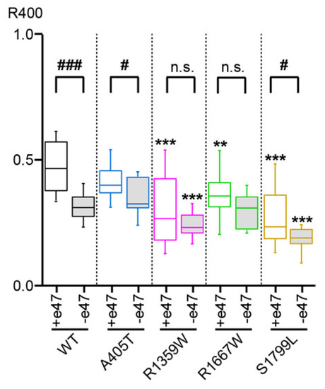 Cav2.1 inactivation kinetics. Box plot of the ratio of remaining current at the end of a 400 ms-long depolarization (R400) to 0 mV (WT, A405T, R1359W, and R1667W Cav2.1 variants) or + 10 mV (S1799L Cav2.1 variants) with respect to the peak current amplitude. Asterisks and number signs denote significant differences vs. WT (** p < 0.01, *** p < 0.001), and vs. Cav2.1+e47 (# p < 0.05, ### p < 0.001), respectively (non-paired Student’s t-test). n.s. = non-significant.