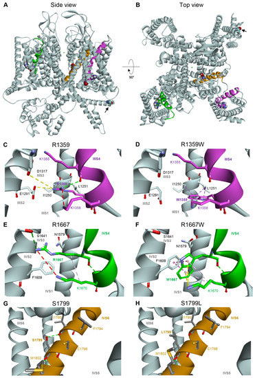 Homology model of human Cav2.1 viewed from the side (A) or from the top (B). The IIIS4, IVS4, and IVS6 transmembrane helices carrying the studied mutation are represented in magenta, dark green, and brown, respectively. The four residues R1359 (IIIS4), R1667 (IVS4), S1799L (IVS6), and A405 (I-II loop, indicated with black arrow) are represented in balls. (C,D) Modeling of the voltage sensing domain (VSD) in repeat III of WT Cav2.1 (C), and Cav2.1 R1359W (D), showing putative non-bonded interactions in dash lines: hydrogen bond pairs in green (K1355 in IIIS4), ionic bond pairs in yellow (E1291 in IIIS2, and to a lesser extent, D1317 in IIIS3), hydrophobic interaction in purple (L1251 in IIIS1). Steric clashes (K1358 in IIIS4) are represented by a red dashed line. (E,F) Modeling of the IV-VSD of WT Cav2.1 (E), and Cav2.1 R1667W (F). (G,H) Modeling of the pore domain around the IVS6 helix of WT Cav2.1 (G), and Cav2.1 S1799L (H).