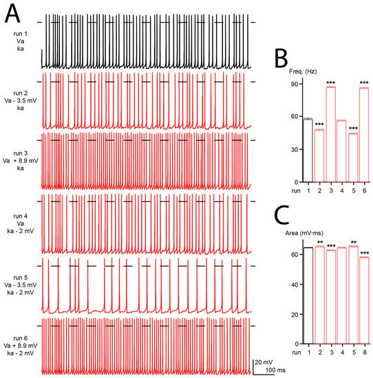 Cav2.1 channels are the predominant Ca2+ channels expressed in Purkinje cells, where they play a fundamental role in cellular excitability [83,84]. Purkinje cells fire spontaneously, and their activity is required to perform planned and coordinated movements. Consequently, malfunction of Purkinje cells often results in motor dysfunctions [85]. To seek the effects of Cav2.1 mutations on neuronal electrical activity, we used a computer model of the human Purkinje cell where all the ionic conductances were modeled with the Hodgkin and Huxley formalism [33]. Six simulations were run with: the wild-type electrophysiological conductances (run 1), a 3.5 mV hyperpolarizing shift of Va (as found with the R1359W variant, run 2), an 8.9 mV depolarizing shift of Va (as found with the S1799L variant, run 3), a 2 mV increase of ka (as found with the R1359W variant, run 4), and both a hyperpolarizing shift of Va and increase of ka (run 5) or a depolarizing shift of Va and increase of ka (run 6) (Figure 8A). We did not observe any modification of action potential frequency and area upon decreasing the steepness of ka (Figure 8B,C). However, the hyperpolarizing shift of Va decreased the frequency and increased the area, while the depolarizing shift produced the opposite effect (Figure 8B,C). Area changes resulted from a modification of the rates of the rising or decaying phases of action potential (not shown). A modification of frequency may be explained by the variation of the Ca2+ influx caused by the Va shift, and consequently an altered amplitude of the KCa was induced after hyperpolarization [85]. The additional modification of ka tends to increase the effects produced by Va changes (Figure 8B,C). These results suggest that the biophysical changes produced by Cav2.1 pathogenic mutations, such as those studied herein, can dramatically alter the firing pattern of neuronal cells.
