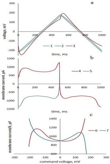 Figure 3a shows the experimental cyclic current–voltage characteristic, the upper branch of which is the experimental response of the membrane to increasing voltage; the lower branch is the temporal inversion of the current response of the membrane to decreasing voltage.