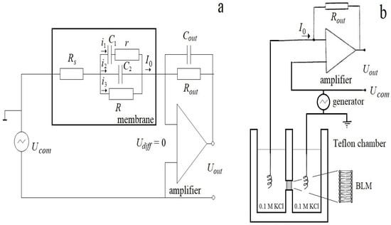 Equivalent circuit of the membrane (a) and measuring system (b).