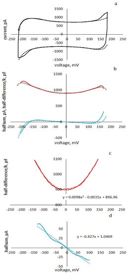 Figure 3b shows the half-difference of the upper and lower branches of the cyclic current–voltage characteristic divided by k (in pF) at the top and the half-sum (in pA) at the bottom. The value of the parameter ϰ = 0.2, which determines the proportion of the viscoelastic part of the membrane, is selected by the point separating the two exponents of transient processes in response to a change in the sign of the slope of the triangular voltage. Figure 3c shows the upper curve in Figure 3b in the region of low voltages and the parabolic fit of this fragment. Comparison with Formula (18) makes it possible to uniquely determine the parameters: = 897 pF, = 11 1/V2.